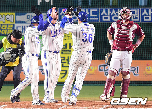 3회말 삼성 공격 1사 2루 상황 이승엽이 우중간 투런포를 날리고 홈을 밟으며 최형우와 인사를 나누고 있다.