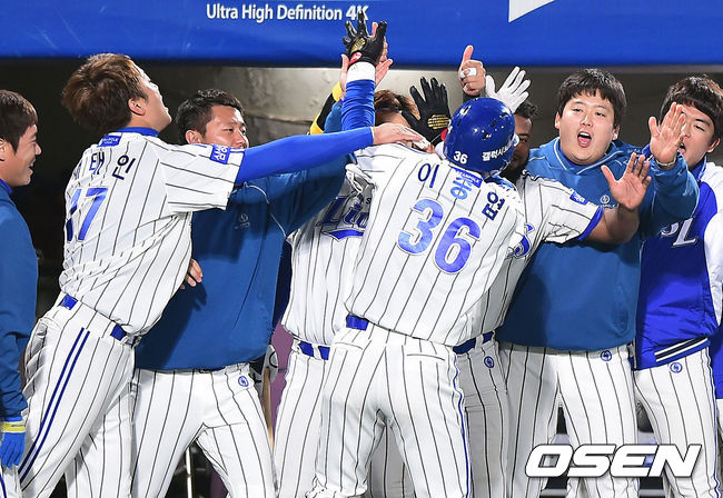 5일 오후 대구야구장에서 열린 2014 한국야쿠르트 세븐 프로야구 포스트시즌 한국시리즈 2차전, 3회말 2사 2루 삼성 이승엽이 2점 홈런을 날리고 동료들의 축하를 받고 있다.