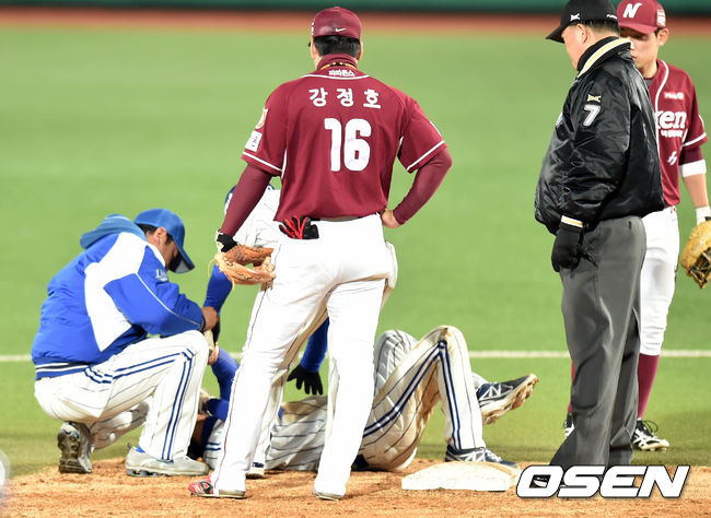 5일 오후 대구야구장에서 열린 2014 한국야쿠르트 세븐 프로야구 포스트시즌 한국시리즈 2차전, 3회말 2사 1루 박해민이 2루 도루를 하다 부상을 당해 괴로워하고 있다.