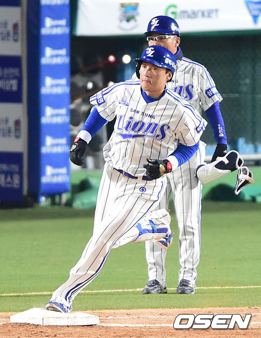 3회말 삼성 공격 1사 2루 상황 이승엽이 우중간 투런포를 날리고 그라운드를 돌고 있다.