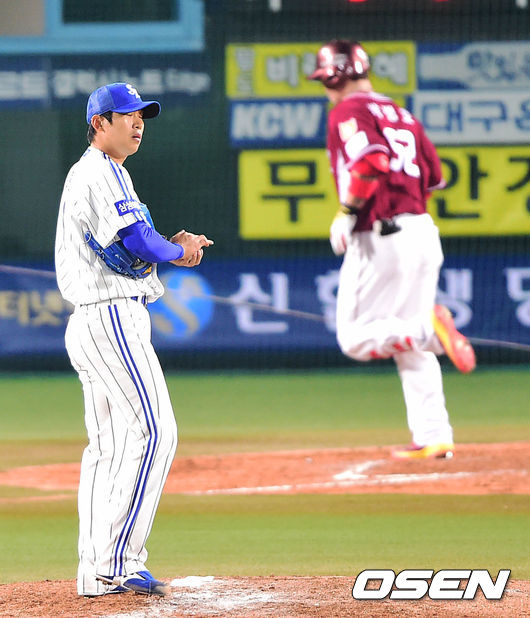 4회초 넥센 공격 2사 주자없는 상황 박병호에게 추격의 중월 솔로포를 허용한 삼성 선발 윤성환이 아쉬워하고 있다.