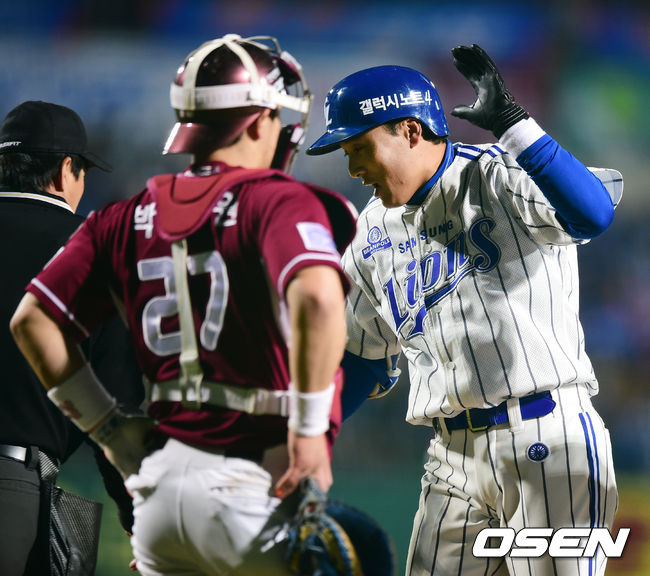 5일 오후 대구야구장에서 열린 2014 한국야쿠르트 세븐 프로야구 포스트시즌 한국시리즈 2차전, 3회말 2사 2루에서 삼성 이승엽이 투런포를 날리고 기뻐하고 있다.