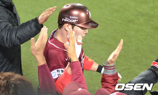 5일 오후 대구야구장에서 열린 2014 한국야쿠르트 세븐 프로야구 포스트시즌 한국시리즈 2차전, 4회초 넥센 박병호가 솔로 홈런을 날린뒤 동료들의 축하를 받고 있다.