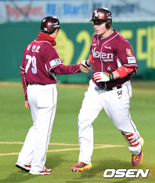 5일 오후 대구야구장에서 열린 2014 한국야쿠르트 세븐 프로야구 포스트시즌 한국시리즈 2차전, 4회초 넥센 박병호가 솔로 홈런을 날린뒤 최만호 코치의 축하를 받고 있다.
