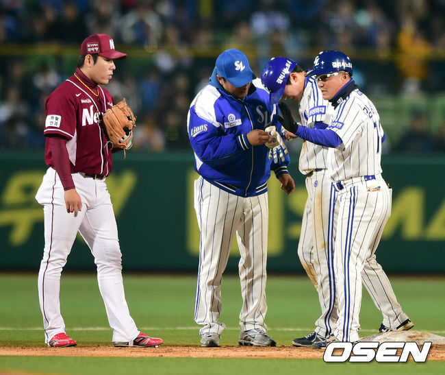 5일 오후 대구야구장에서 열린 2014 한국야쿠르트 세븐 프로야구 포스트시즌 한국시리즈 2차전, 삼성 박해민이 5-0으로 앞선 3회말 2사 후 몸에 맞는 공으로 1루를 밟았고 이지영 타석에서 2루 도루를 성공시켰다. 이 과정에서 박해민은 헤드퍼스트 슬라이딩으로 2루를 잡았는데 왼손 약지가 베이스에 걸려 꺾이는 부상을 당했다.