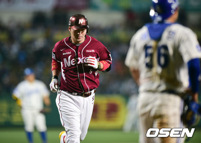 5일 오후 대구야구장에서 열린 2014 한국야쿠르트 세븐 프로야구 포스트시즌 한국시리즈 2차전, 4회초 2사에서 넥센 박병호가 솔로포를 날리고 홈을 밟고 있다.