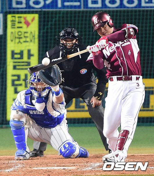 5회초 넥센 공격 선두타자로 나선 김민성이 좌익수 방면 2루타를 날리고 있다.