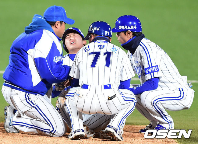 5일 오후 대구야구장에서 열린 2014 한국야쿠르트 세븐 프로야구 포스트시즌 한국시리즈 2차전, 3회말 2사 1,2루 삼성 이지영의 타석, 도루성공한 박해민이 손가락 부상으로 고통스러워하고 있다
