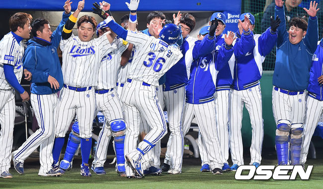 5일 오후 대구야구장에서 열린 2014 한국야쿠르트 세븐 프로야구 포스트시즌 한국시리즈 2차전, 3회말 2사 2루 삼성 이승엽이 2점 홈런을 날리고 동료들의 축하를 받고 있다.
