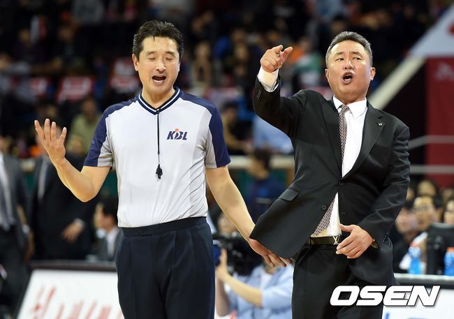 4쿼터 KT 전창진 감독이 라인아웃 판정때 SK 선수의 몸에 맞았다 어필하고 있다.