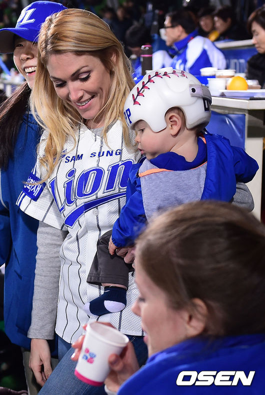 5일 오후 대구야구장에서 열린 2014 한국야쿠르트 세븐 프로야구 포스트시즌 한국시리즈 2차전,삼성 마틴 아내 애린과 아들, 밴덴헐크 아내 애나가 관전하고 있다.