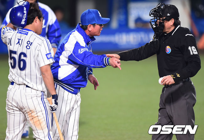 5일 오후 대구야구장에서 열린 2014 한국야쿠르트 세븐 프로야구 포스트시즌 한국시리즈 2차전,6회말 삼성 선두타자 이지영이 자신의 타구에 맞은뒤 아웃되자 류중일 감독이 나와 항의하고 있다.
