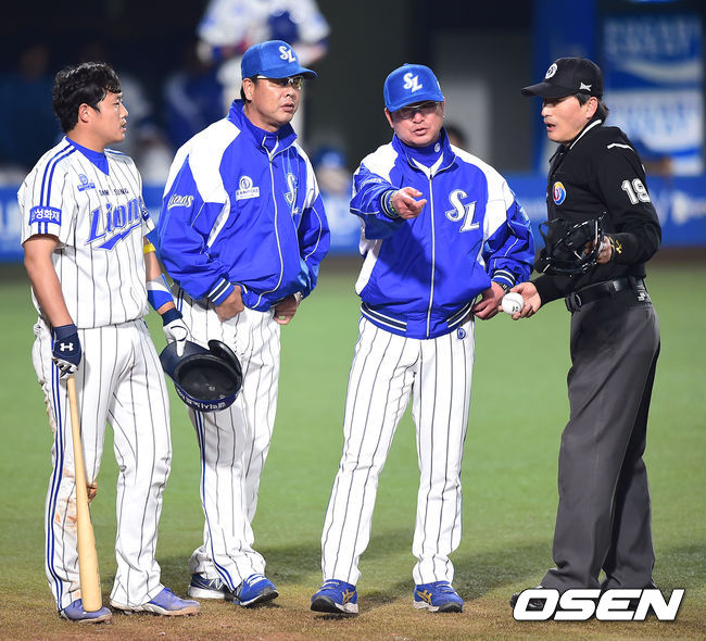 5일 오후 대구야구장에서 열린 2014 한국야쿠르트 세븐 프로야구 포스트시즌 한국시리즈 2차전,6회말 삼성 선두타자 이지영이 자신의 타구에 맞은뒤 아웃되자 류중일 감독이 나와 항의하고 있다.