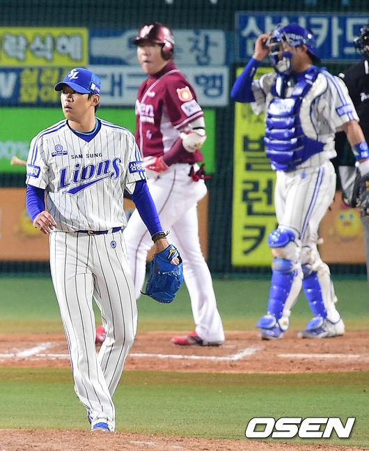 7회초 넥센 공격 선두타자로 나선 강정호를 삼성 선발 윤성환이 삼진으로 돌려세우고 있다.