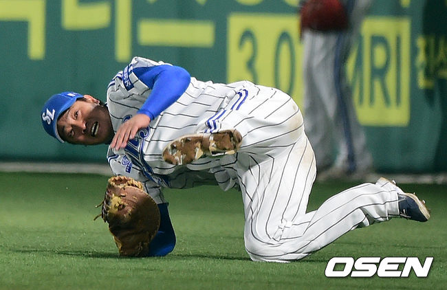 5일 오후 대구야구장에서 열린 2014 한국야쿠르트 세븐 프로야구 포스트시즌 한국시리즈 2차전, 7회초 1사에서 삼성 채태인이 넥센 김민성의 파울타구를 잡아내고 있다.