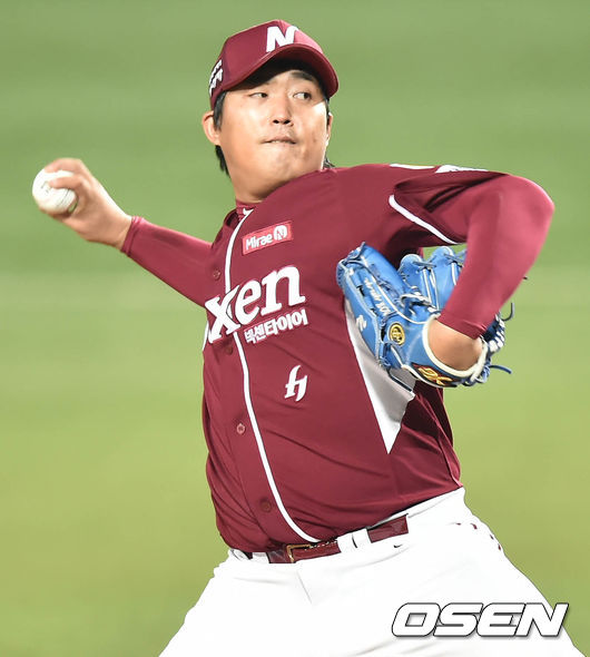 5일 오후 대구야구장에서 열린 2014 한국야쿠르트 세븐 프로야구 포스트시즌 한국시리즈 2차전, 넥센 세 번째 투수 김영민이 힘차게 공을 뿌리고 있다.