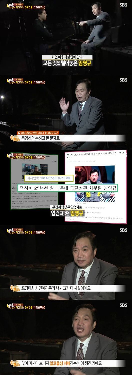 이어 임영규는 무전취식, 택시 무임승차 등의 잦은 구설수에 대해 “나한테 문제가 있다”고 말했다. 그는 “이혼하고 아이들을 못 보고, 미국 가서 사업을 실패하고 많은 돈을 잃고 나니 잠이 오지 않더라. 술을 많이 마시다보니 알코올성 치매가 생겼다”고 말했다.