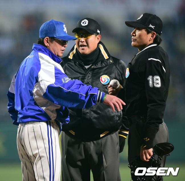 5일 오후 대구야구장에서 열린 2014 한국야쿠르트 세븐 프로야구 포스트시즌 한국시리즈 2차전, 6회말 선두타자로 나선 삼성 이지영이 타구에 맞아 아웃되자 류중일 감독이 그라운드에 나와 심판진에 불만을 나타내고 있다.