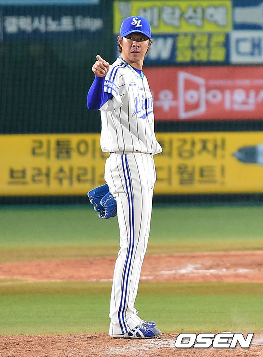 9회초 넥센 공격 1사 1루 상황 박병호 타석을 앞두고 삼성 투수 임창용이 야수들에게 사인을 보내고 있다.