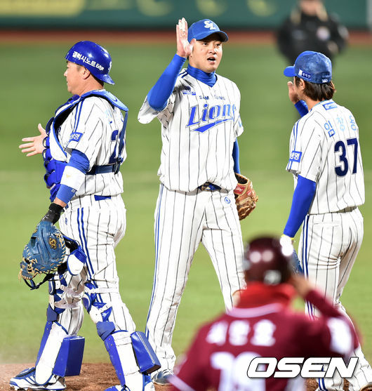 승리를 거둔 삼성 선수들이 마운드에 모여 승리의 기쁨을 나누고 있다./spjj@osen.co.kr