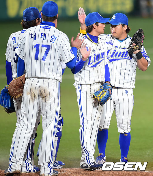 승리를 거둔 삼성 선수들이 마운드에 모여 승리의 기쁨을 나누고 있다./soul1014@osen.co.kr
