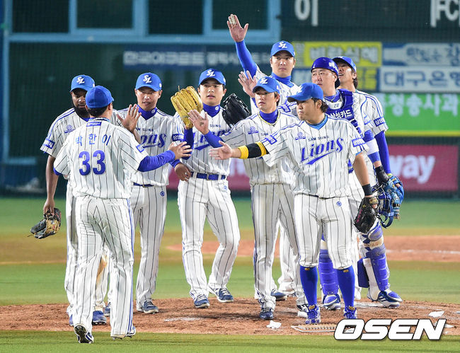 삼성 선수들이 마운드에서 하이파이브 인사를 나누고 있다./dreamer@osen.co.kr