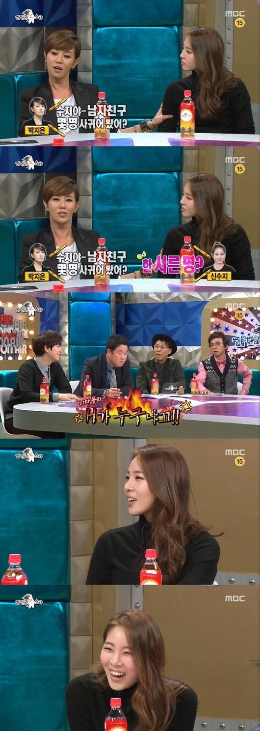 신수지는 5일 오후 방송된 MBC 예능프로그램 '황금어장-라디오스타'(이하 '라디오스타')에서 "만나 본 남자만 30명 이상이다"라는 박지은의 폭로에 대해 "정식으로 사귄 게 없다. 선수 할 땐 바빠서, 일주일에 한 번 보다가 '미안, 나 전지훈련가' 이런 식이었다. 진지하게 만난 사람은 없다"고 말했다.