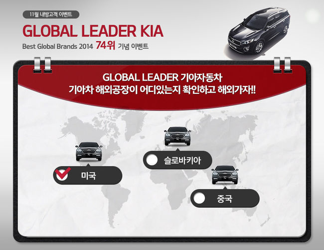 기아자동차(주)가 세계 최고 브랜드 컨설팅 업체인 '인터브랜드(Interbrand)'가 발표한 '2014 글로벌 100대 브랜드(Best Global Brands 2014)'에서 전체 순위 74위에 오른 것을 기념하며, 응모자들이 글로벌 문화체험을 직접 해볼 수 있는 이벤트를 실시한다.
