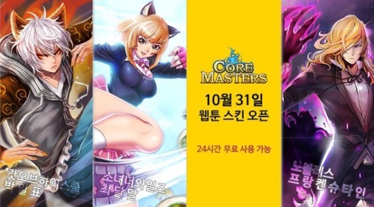 지난 달 31일 소프트빅뱅은 코어마스터즈의 3종 웹툰 콜래보 스킨을 공개했다. 콜래보 스킨 각 3종은 모두 인기 웹툰들의 캐릭터로 ‘코어마스터즈’ 오픈 전부터 많은 관심과 기대를 받아왔다. 모두 원작의 느낌을 잘 살려서 게임내에서 그대로 구현시켰다.