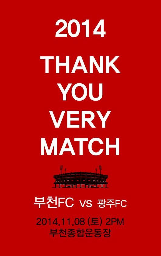 부천FC는 8일 부천종합운동장에서 열리는 2014 K리그 챌린지 35R 광주FC와의 마지막 홈경기를 ‘Thank you very MATCH’로 정하고 다양한 이벤트를 실시한다. 이번 이벤트는 올 시즌 부천을 열광적으로 응원해준 팬들에게 감사의 마음을 전하고, 보답하기 위해 마련했다.