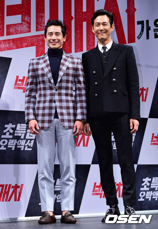 6일 오전 서울 강남구 CGV 압구정에서 열린 영화 '빅매치' 제작보고회에서 신하균과 이정재가 포토타임을 갖고 있다.