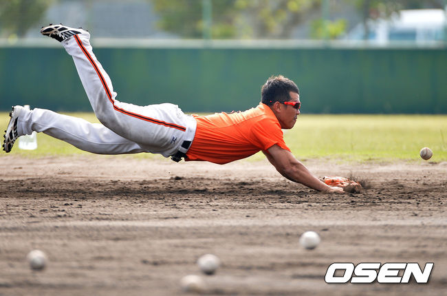 6일 오전 일본 오키나와 고친다 구장에서 한화 이글스 2014 마무리 캠프가 진행됐다. 정근우가 펑고 훈련을 하고 있다.
