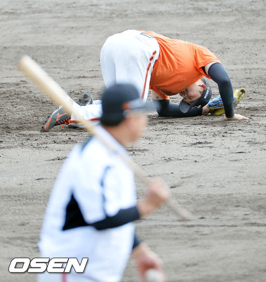 6일 오전 일본 오키나와 고친다 구장에서 한화 이글스 2014 마무리 캠프가 진행됐다. 김태완이 펑고 훈련을 하며 일어서질 못하고 있다.