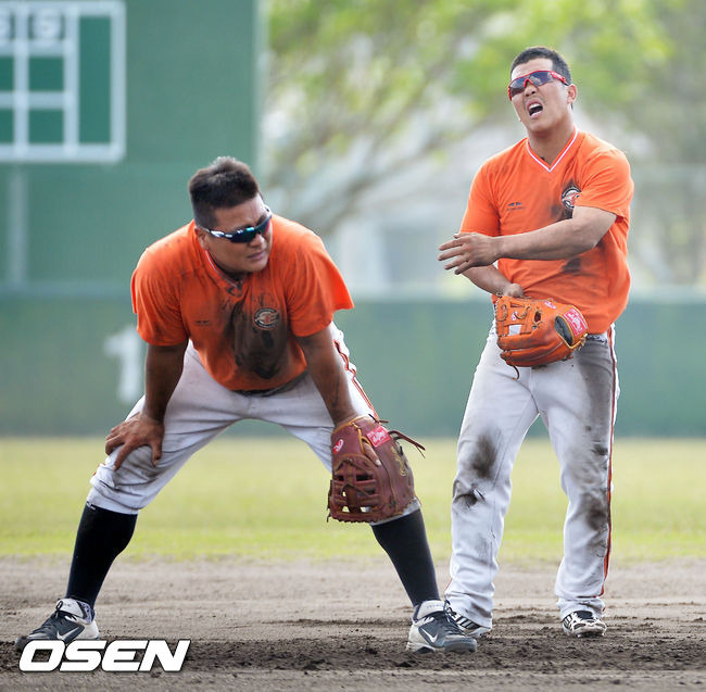 6일 오전 일본 오키나와 고친다 구장에서 한화 이글스 2014 마무리 캠프가 진행됐다. 김태균과 정근우가 펑고 훈련을 하고 있다.
