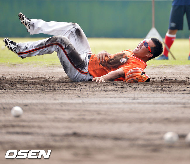 6일 오전 일본 오키나와 고친다 구장에서 한화 이글스 2014 마무리 캠프가 진행됐다. 정근우가 펑고 훈련을 하며 고통스러워 하고 있다.