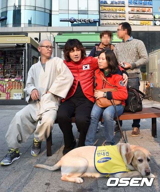 가수 김장훈이 슈퍼주니어 이특, 강인의 다음 주자인 스님과 시각장애를 가진 팬과 이야기를 나누고 있다.