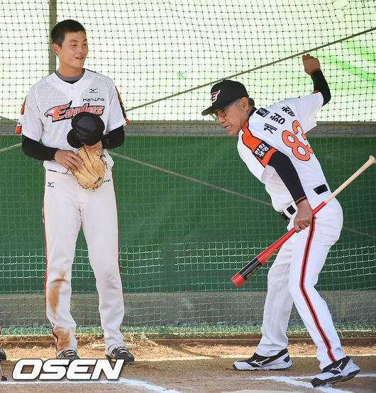 6일 오전 일본 오키나와 고친다 구장에서 한화 이글스 2014 마무리 캠프가 진행됐다. 계형철 투수 코치가 정대훈에게 불펜에서 시범을 보이고 있다.