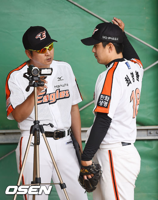 6일 오전 일본 오키나와 고친다 구장에서 한화 이글스 2014 마무리 캠프가 진행됐다. 정민태 투수 코치 최영환에게 녹화된 투구폼을 보여주며 말을 하고 있다.