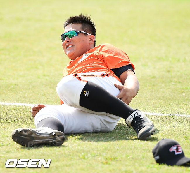 6일 오전 일본 오키나와 고친다 구장에서 한화 이글스 2014 마무리 캠프가 진행됐다. 김태균이 몸을 풀며 미소짓고 있다.