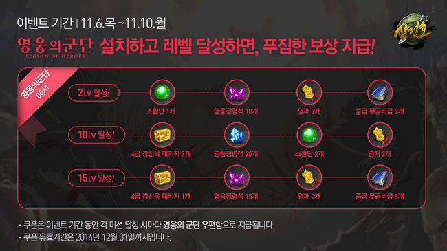 ‘영웅의 군단’ 신규 회원 가입 후 특정 레벨(2 10 15레벨)을 달성한 유저에게 ‘삼검호’에서 사용할 수 있는 ‘영웅정력석’, ‘4급 강신옥 패키지’ 등 다양한 게임 아이템을 지급한다.