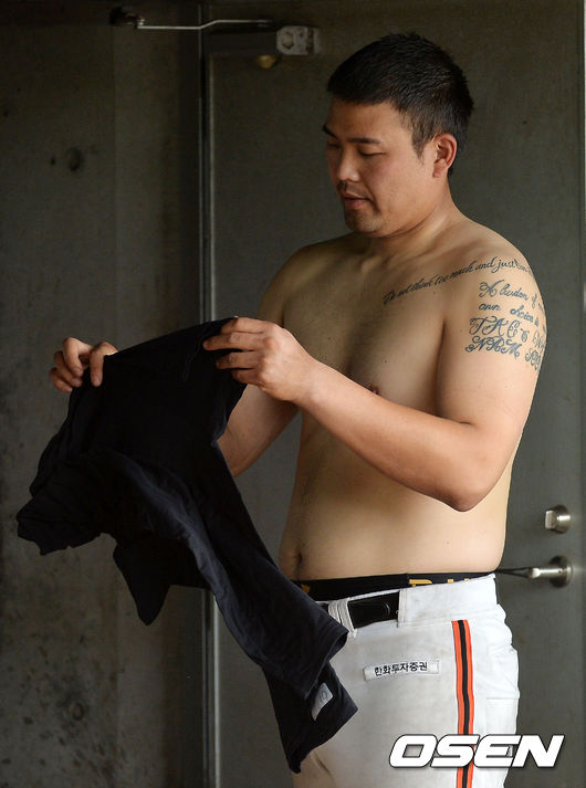 6일 오전 일본 오키나와 고친다 구장에서 한화 이글스 2014 마무리 캠프가 진행됐다. 김태완이 펑고 훈련을 마친 후 유니폼을 벗고 있다.
