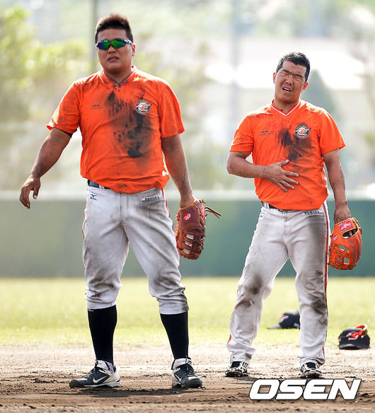 6일 오전 일본 오키나와 고친다 구장에서 한화 이글스 2014 마무리 캠프가 진행됐다. 김태균과 정근우가 펑고 훈련을 하고 있다.
