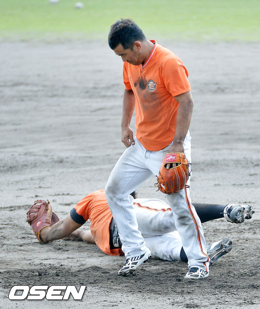 6일 오전 일본 오키나와 고친다 구장에서 한화 이글스 2014 마무리 캠프가 진행됐다. 쓰러진 김태균이 정근우에게 자리를 비켜주며 굴러가고 있다.