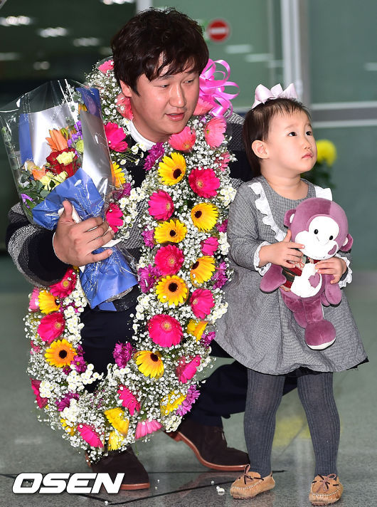 생애 첫 정규시즌 우승과 재팬시리즈 우승을 한 소프트뱅크 호크스의 이대호가 6일 가족과 함께 부산 김해국제공항을 통해 귀국했다.