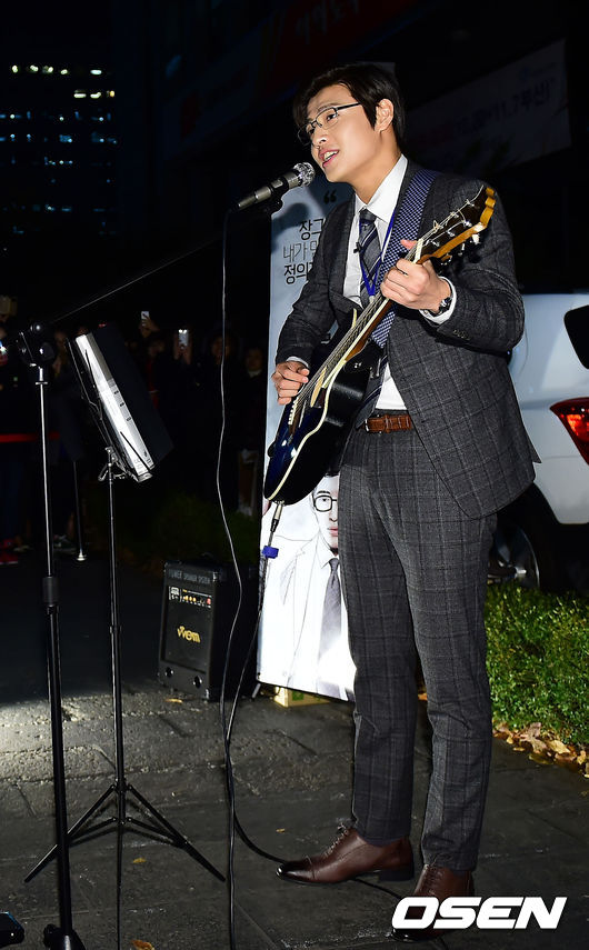 배우 강하늘이 길거리 미니 콘서트에서 멋진 노래를 선보이고 있다.