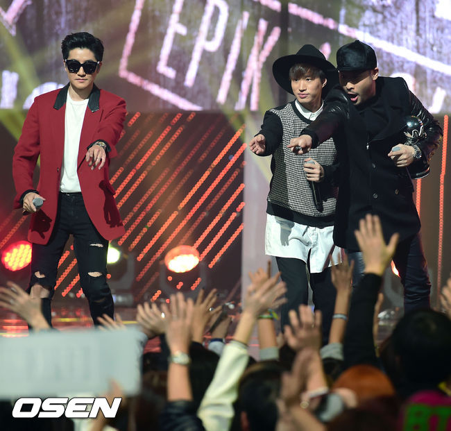 6일 오후 서울 마포구 상암동 CJ E&M센터에서 열린 Mnet '엠카운트다운' 현장공개에서 1위를 차지한 에픽하이가 공약으로 내세운 콘서트 초청 관객을 지목하고 있다.