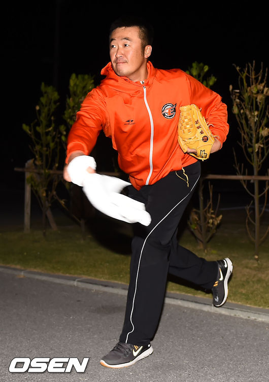 6일 일본 오키나와 고친다 구장에서 한화 이글스 2014 마무리 캠프가 진행됐다. 임경완이 야간에 섀도우 피칭을 하고 있다.