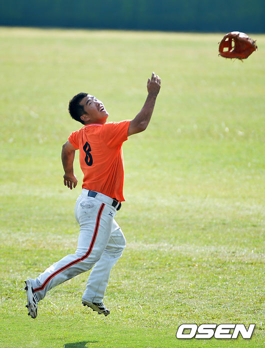 6일 오전 일본 오키나와 고친다 구장에서 한화 이글스 2014 마무리 캠프가 진행됐다. 정근우가 펑고 훈련을 하며 뜬 공을 향해 글러브를 던지고 있다.