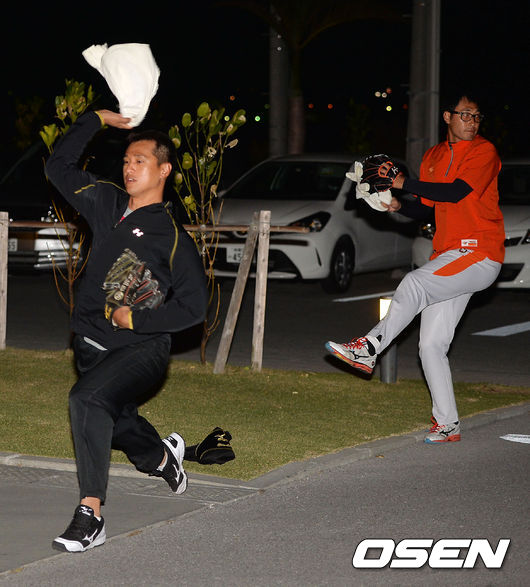 6일 일본 오키나와 고친다 구장에서 한화 이글스 2014 마무리 캠프가 진행됐다. 윤규진 정재원이 셰도우 피칭을 하고 있다.