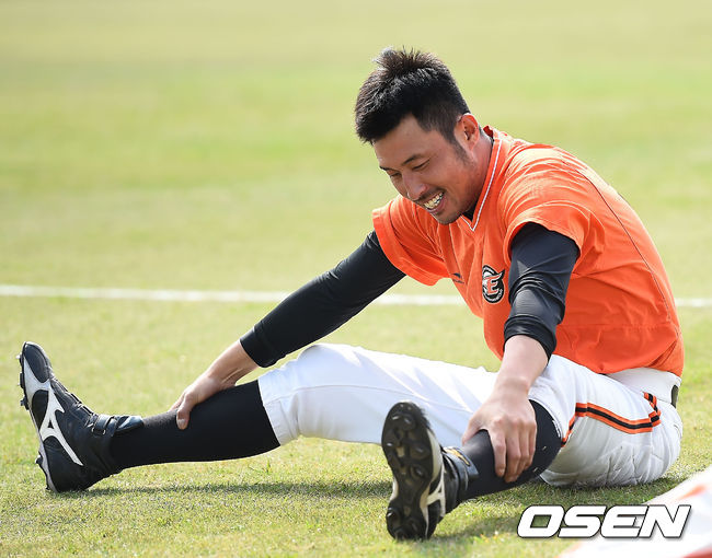 6일 일본 오키나와 고친다 구장에서 한화 이글스 2014 마무리 캠프가 진행됐다. FA 눈앞에두고도 마무리 훈련을 자청한 김경언이 몸을 풀며 미소짓고 있다.